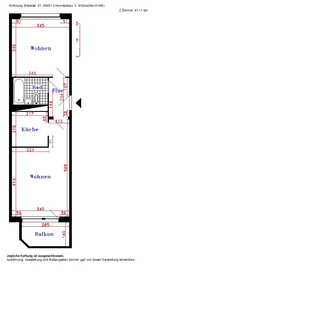 Die Wohnung verfügt über ein Wohnzimmer, ein Schlafzimmer, eine Küche und ein Bad mit Wanne. Zur Wohnung gehört ein Kellerverschlag.
